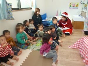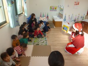 クリスマスにちなんだ絵本を読んでもらったり、保育士1人1人からの出し物を楽しむ子どもたち🎵