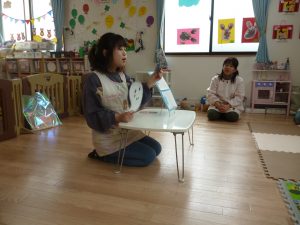 その後、保育士が「くいしんぼうおばけ」のペープサートをしてくれました♫「なにかな?なにかな?」と保育士が何の食べ物か尋ねると「チョコレート!」「アイス!」と元気な声で答えてくれましたよ👏✨