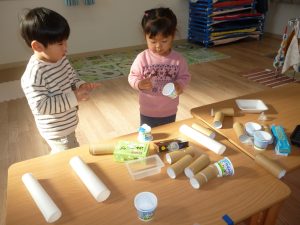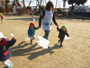 フィリオ便り 1月の子どもたちの様子 2021年2月9日 寒さが増してもフィリオ清須の子どもたちは元気いっぱいです。 ビニール袋にシールを貼ってたこ糸をつけると素敵な凧ができました。 天気の良い日には園庭で凧あげを楽しんでいますが 広い公園で遊ぶときは、とびっきりの笑顔をみせてくれる子どもたちです。 みなさまから頂いたいろいろな廃材を使って造形あそびの様子です。 好きな材料を好きなだけ選び 組み立てたり飾りつけをしたり、みんな夢中で取り組んでいました。