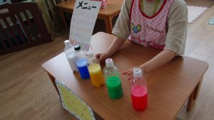透明の水が入ったペットボトルにみんなで「ちちんぷいぷいのぷい!」とおまじないをしました。