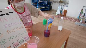 青色と赤色を混ぜて紫色に変身。ぶどうジュースも完成しました。