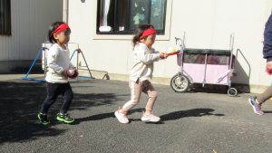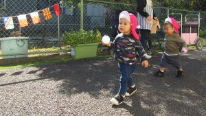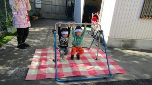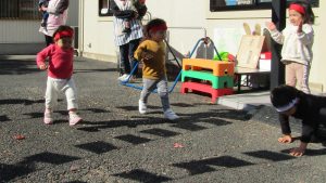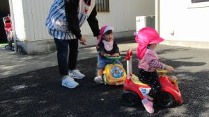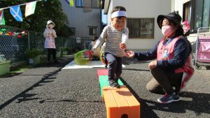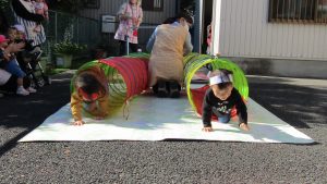 みんなに応援されながら保育士がいるゴールの所まで乗ることができました!