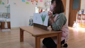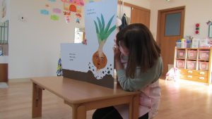 子どもたちは、「にんじん」「おいも」「たまねぎ」と次々と野菜の名前を答えていましたよ!