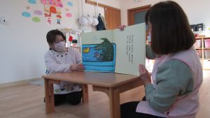 保育士の出し物は、『やさいさん』と『わにわにのおふろ』の大型絵本です。