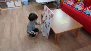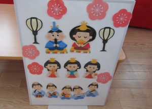 お部屋の中に隠れているひな人形や桃の花のカードを探してホワイトボードに貼りました。