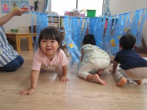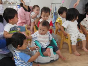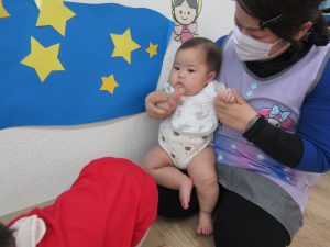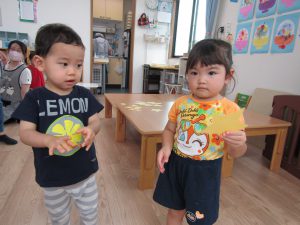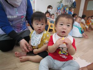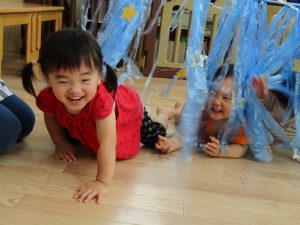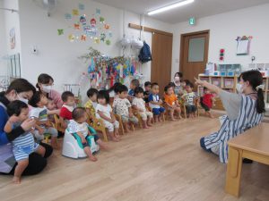 お話に出てくる笹飾りが、みんなの作ったものと一緒だったからでしょうか、真剣な様子でお話を聞いていました♪また、可愛いうさぎさんや動物達の登場にも喜んで大きな声を出していましたよ~!