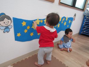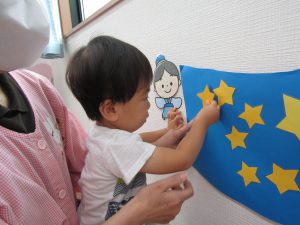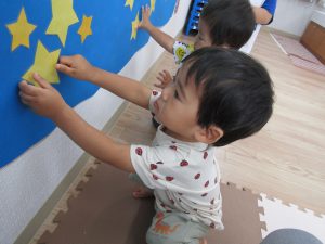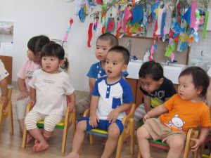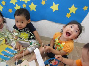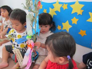 お部屋には、みんなの作った可愛い笹飾りや短冊がいっぱいの笹が飾られ、みんな興味津々!保護者の皆さま、短冊のご協力ありがとうございました。
