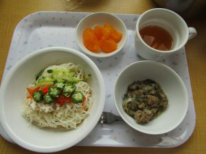 七夕会の後は、美味しい給食!メニューは〝七夕にゅうめん〟で、おくらのお星様で天の川を作っていただき、みんなでモリモリ食べました♪