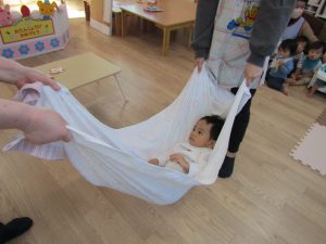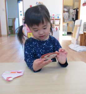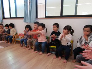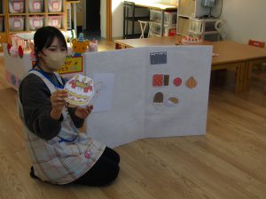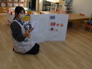 まぁ!すごいですね☆ふたば組さん(0歳児)もみんな集中して観ていますね。たいよう組さんは、食べ物のシルエットで「ケーキ!」「たまねぎ!」と次々と当ててくれましたよ♪