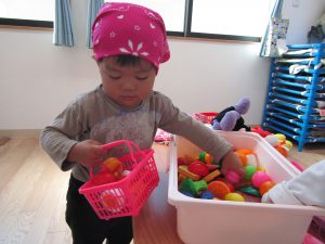 お部屋では、1・2歳児縦割りクラスで お店屋さんごっこをしてますよ。