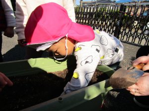 この穴にいれるんだね!土のお布団、かけてあげなくちゃ!