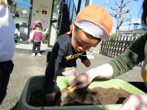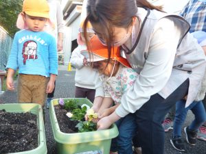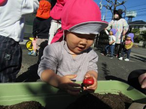 先日、芋掘りも終わり寂しくなったプランターに、みんなでパンジーチューリップの球根を植えました!