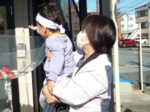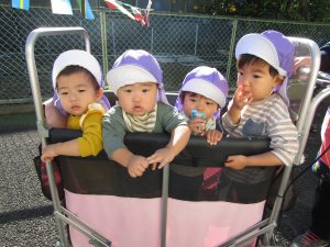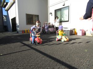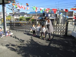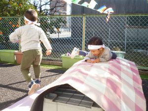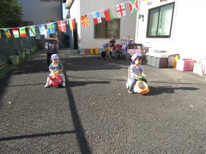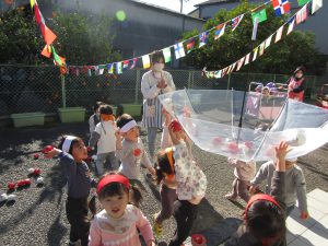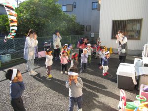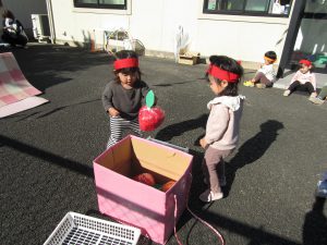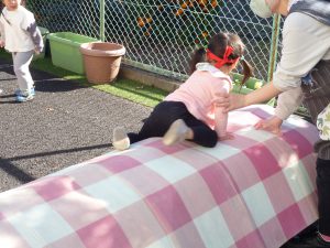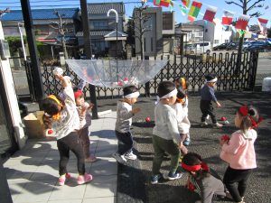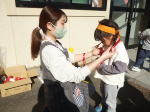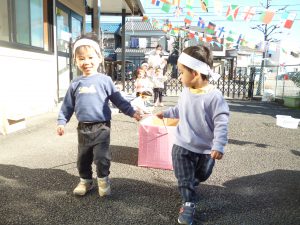 11月25日(金)ミニ運動会がありました!秋晴れの青空の下でハチマキを結んでもらい、やる気満々の子ども達☆頑張るぞ~!!!
