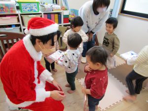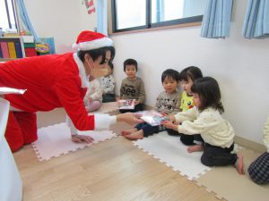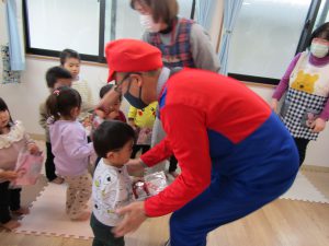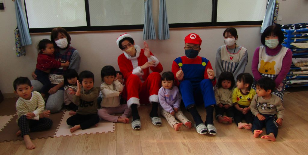突然のサンタクロース、スーパーマリオ、お姉さんのご訪問に、子ども達の表情は硬く緊張している様子。