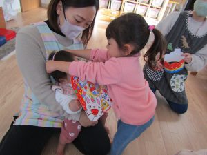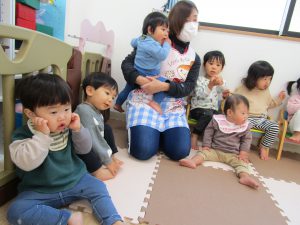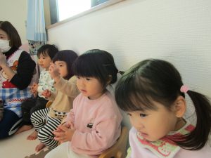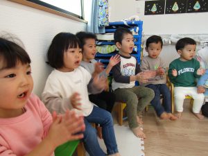 ふたば組さんも先生の振り付けを真似て頬に手をもっていったり、体をゆらゆら揺らしたりして、楽しく参加していました。