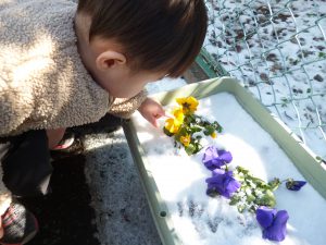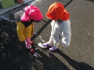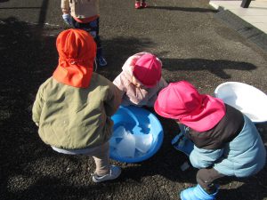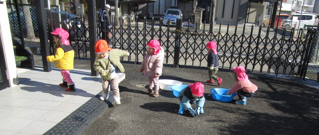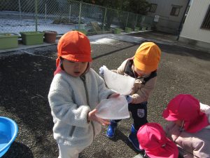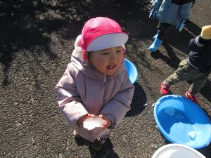 氷や雪が冷たくても、お友達とキャッキャッとはしゃぎながら楽しんだ子ども達。今度は、子ども達の好きなカップや、花・落ち葉などの自然物を水の中に入れて凍らせてみたいと思います。これからも寒さに負けずたくさん身体を動かし、元気いっぱい遊ぶぞ~~~!