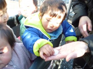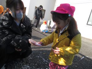 おや?子ども達がうっすら積もった雪を見つけましたよ!触ってみたり、踏んだ時の音を楽しんだりしていました。