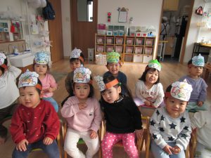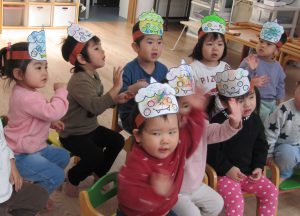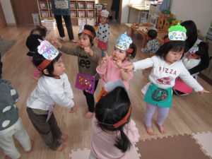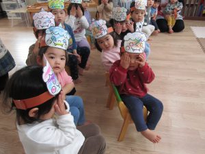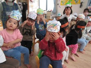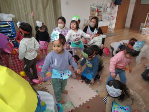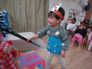2月3日(金)節分。子ども達は、自分で作った〝鬼のお面〟〝鬼のパンツ〟を身に付け、節分の会に参加しました!