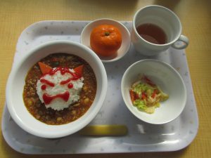 豆まきが終わったあとは、調理員さんが鬼の顔の給食を作ってくれましたよ☆