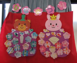 お部屋には、染め紙やにじみ絵で作られたおひなさまが飾られましたよ。