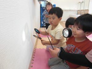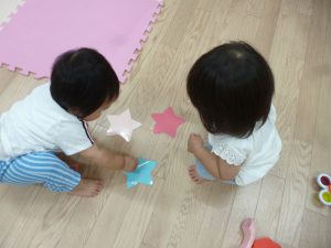 フィリオ便り 七夕会のおもいで 2024年7月19日 7月5日、1階のお部屋に笹を飾り七夕会を行いました。 きらきら星を歌ったり、星の影絵を見たり… あっ!ここにもお星さまがあるよ! 天の川を渡って「織姫と彦星をつれてって」ゲーム。 織姫と彦星を落とさないようにそ~っとそ~っと…静かに運ぶのもみんな上手。 2歳児のお友だちは小さなお友だちを気づかいながらリードする姿が見られました。 七夕会に因んでこんな面白い体験もしてみました。