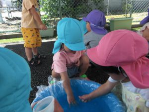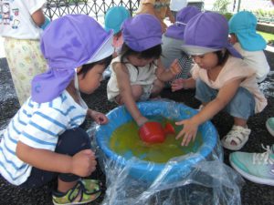 フィリオ便り 色水であそんだよ 2024年7月19日 フィリオ清須の子どもたち、今日は何して遊んでいるのかな? お花紙をタライに浮かべて色水あそびをしました。 ふわふわ浮かんでは溶けるお花紙をながめたりかき混ぜたり… 最後はドロドロの色水が出来ました。 それを丸めるとキレイなお団子の出来上がり。 夕方まで乾かして固くなったお団子もみんなで触りました。 明日ままごとに使おうかな?