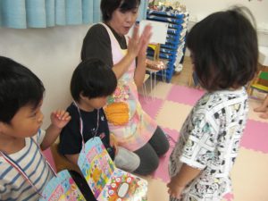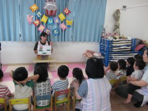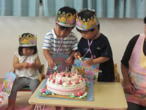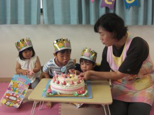 フィリオ便り 7月の誕生会 2024年7月19日 7月生まれのお友だち 暑い暑い夏に生まれたのですね。 今月は3人のお友だちをお祝いしました。 次の月がお誕生日のお友だちがカードを掛けてくれます。 フー みんなで一緒にロウソクを立てたり「フー」っと消したり… 先生の出し物は「三匹のこぶた」のスケッチブックシアターでした。 「さんびきのこぶたの1匹が~」と歌でもお馴染みのお話に夢中のみんな。 このあと楽しい遊びに発展しました… つづく…