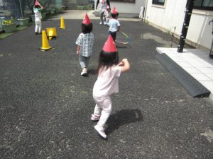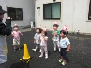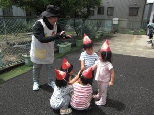 フィリオ便り 「さんびきのこぶたごっこ」をしました 2024年7月24日 前回のつづきです。 誕生会のあとに「さんびきのこぶたごっこ」をしました。 こぶたちゃんの三角帽子がよく似合ってますね。 カラーコーンをお家に見立てて… 「さんび~きのこぶたの1ぴきが~♪」 「わらのおうちをたてました~♪」 おなじみの歌に合わせてごっこあそびが始まりました。 は~の~ひ~の~ふ~~! きゃーっ! みんなで遊ぶとこんなに楽しいね! また遊ぼうね!