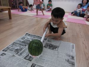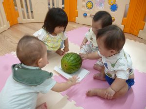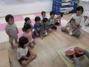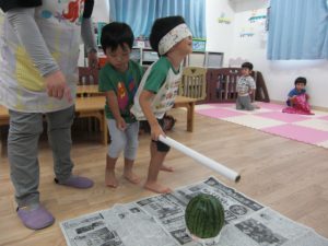 フィリオ便り スイカ割りをしました 2024年8月7日 今日のおやつはすいか🍉です すいかって重いかな? ちょっと持ってみる? 1人ずつすいかを持ってみました ちょっと触ってみようね えいっ! 勢いよく正面から割ろうとする子や棒でつついて様子を見る子・・・ みんなそれぞれのスタイルでスイカ割りに参加しました もっとこっちだよ! お友だちを応援して前に出てくる子もいました 微笑ましいですね 最後にスイカを半分に割って見るとみんな興味津々! 「おやつが楽しみだね」 午後のおやつに美味しくいただきました