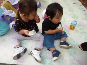 フィリオ便り 遠足に出かけたよ 2024年10月28日 11月18日、 保育者がみんなの前で握ったおにぎりを持って花咲公園に出かけました 公園に着いたら、まずはおにぎりタイム♪ おいしい?よね~♪ おいしい?食べたら遊ぼうね♪ 一緒にピョンピョンしよ♪ なに描いたの? カメさんいるかな? きょうも会えたね~ 楽しい秋の遠足でした