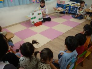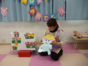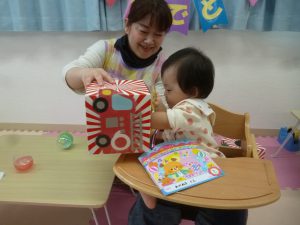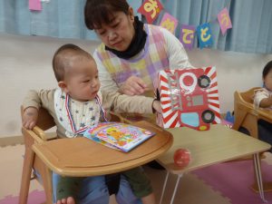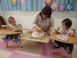 フィリオ便り お誕生日会をしました(10月のお友だち) 2024年11月9日 今月は小さなお友だち2名のお誕生会でした。 1才になりました。 冠をかぶせてもらって嬉しそうですね。 興味津々で先生の手元を見ています。 なにしているのかな? ケーキにろうそくを立てていました。 くじ引きをしたり・・・ 先生の楽しいおはなし はじまり、はじまり~ ♪ぞうさんのぼうし👒 みんなでお祝いできてよかったね