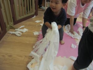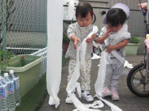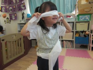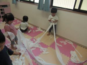 フィリオ便り ハロウィーンごっこまっさかり② 2024年11月27日 「これはな~んだ?」 正解はミイラです。 トイレットペーパーをグルグル回りながら 体に巻きつけて変身しちゃいます。 いないいないばあっ! みんな楽しそうですね♪ さていよいよハロウィンパーティー、 当日の様子も楽しみにしていてくださいね。