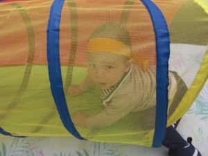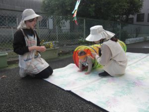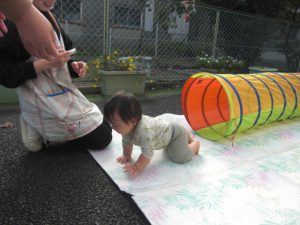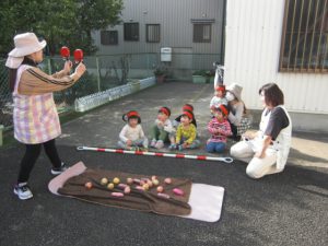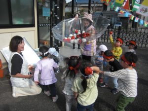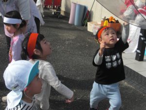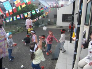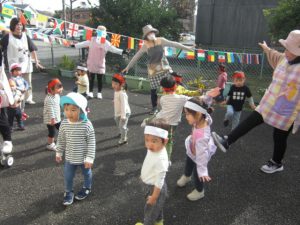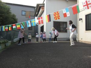 朝からフィリオ清須の園庭に万国旗をかざり、ミニ運動会をしました。