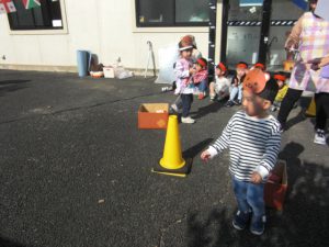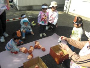 つぎは「おいもリレー」です。まずは、みんなでおいも畑を移動させます。