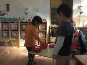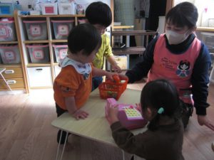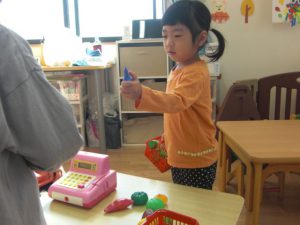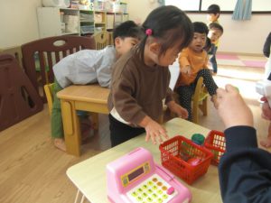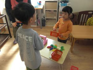 フィリオ便り 八百屋のおみせ♪ 2024年12月6日 「八百屋のお店にならんだ品物みてごらん♪」「よくみてごらん♪」「考えてごらん♪」 ちょっとなつかしいこの歌、ご存じですか? 今日はこの歌をうたいながらお店屋さんごっこをしました。 さて…野菜の名前、いくつ言えるかな? いらっしゃいませ~ どれにしますか? お客さんになったり、お店屋さんになったり かわりばんこで遊びましょ。 なすください なすも知っているんだね。たくさん言えるね! かぼちゃどこかな… これもこれも… たくさん買えたね。 またみんなで遊ぼうね。