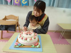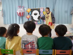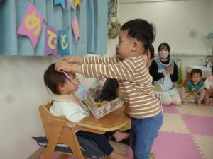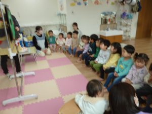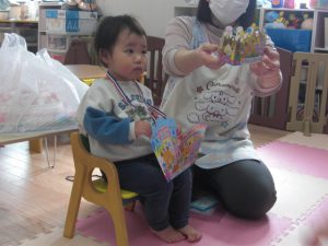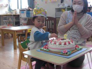 フィリオ便り お誕生会をしました(3月生まれのお友だち) 2025年4月2日 3月生まれのお友だちの誕生会をしました。 今月は二人のお友だち。 誰かペンダント掛けてくれるかな? お誕生日おめでとう♪ ロウソクの灯を… ふぅ~♪ つぎは先生の出し物「おばけのばけたくん」です。 絵本で見るのとは違って、大きな「ばけたくん」から目が離せない子どもたち。 みんな楽しそうに見入っていましたよ。 今年度のお誕生会はこれでおしまいです。 来年度も楽しい事を盛りだくさん、 準備していますので楽しみにしていてくださいね。
