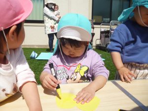 ドキドキで入園したお友達は涙ぐむ姿もありましたが、みんなが遊んでいる様子を見て、すぐに打ち解け元気いっぱい過ごしています。また、進級した子ども達は、前年度のたいよう組さんをよく見ていたのでしょうね。保育士のお手伝いを進んで行ったり、お兄さん達の間でブームになっていた〝しっぽとり〟を受け継がれたのかのように「しっぽとりやりたい!」と園庭を走り回っています!