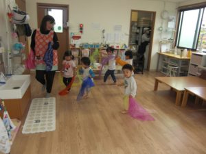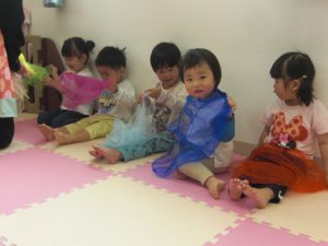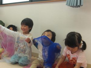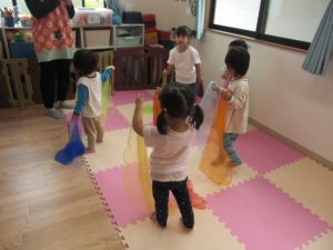 リトミックスカーフを使って各クラスいろんな遊びを楽しみました。