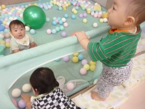 ボールを両手いっぱいに抱えようとしたり、ボールを追いかけたりして楽しむお友だち♪大きいボールを掴んで得意げな表情です☆