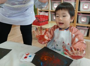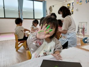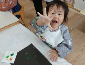 手のひらを絵の具でいっぱいにして、とっても楽しそうですね🎶