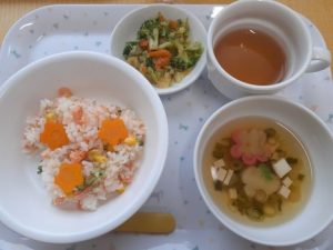 お給食は、お花の形をしたニンジンさんが乗った可愛らしいちらし寿司でした♡