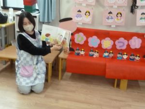 ひなまつり会では、絵本『だあれ?だあれ?のひなまつり』を読みました。絵本に出てきたひな壇のイラストを見て「かわいいね~♡」と嬉しそうな声も聞こえてきましたよ~!
