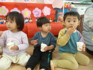 お花のシールを貼って可愛く飾りつけをした紙コップにひなあられをいれて…いただきま~す!