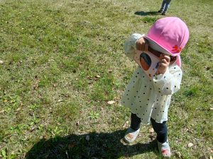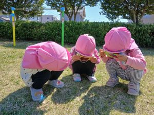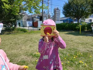 とっても暖かい春の日に、カラーセロファンで作ったカメラを持ってお散歩に行きました。